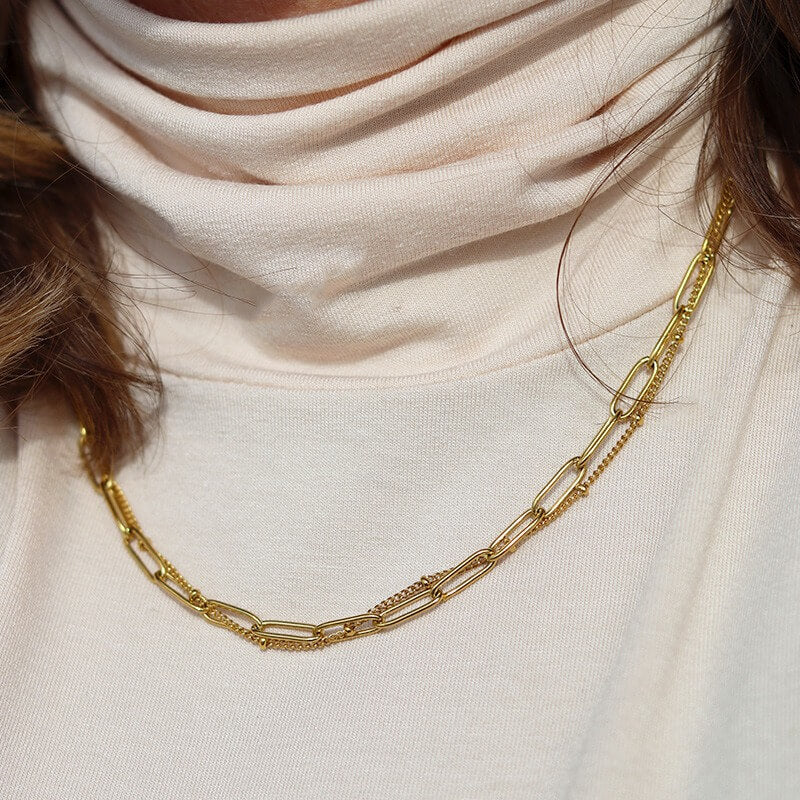 This double-layered choker is an absolute trend this season. The thin and thick chains make a perfect combination. The necklace is made of stainless steel, so it is waterproof. The color remains perfect! Finish the look with the BRAVE. bracelet.
