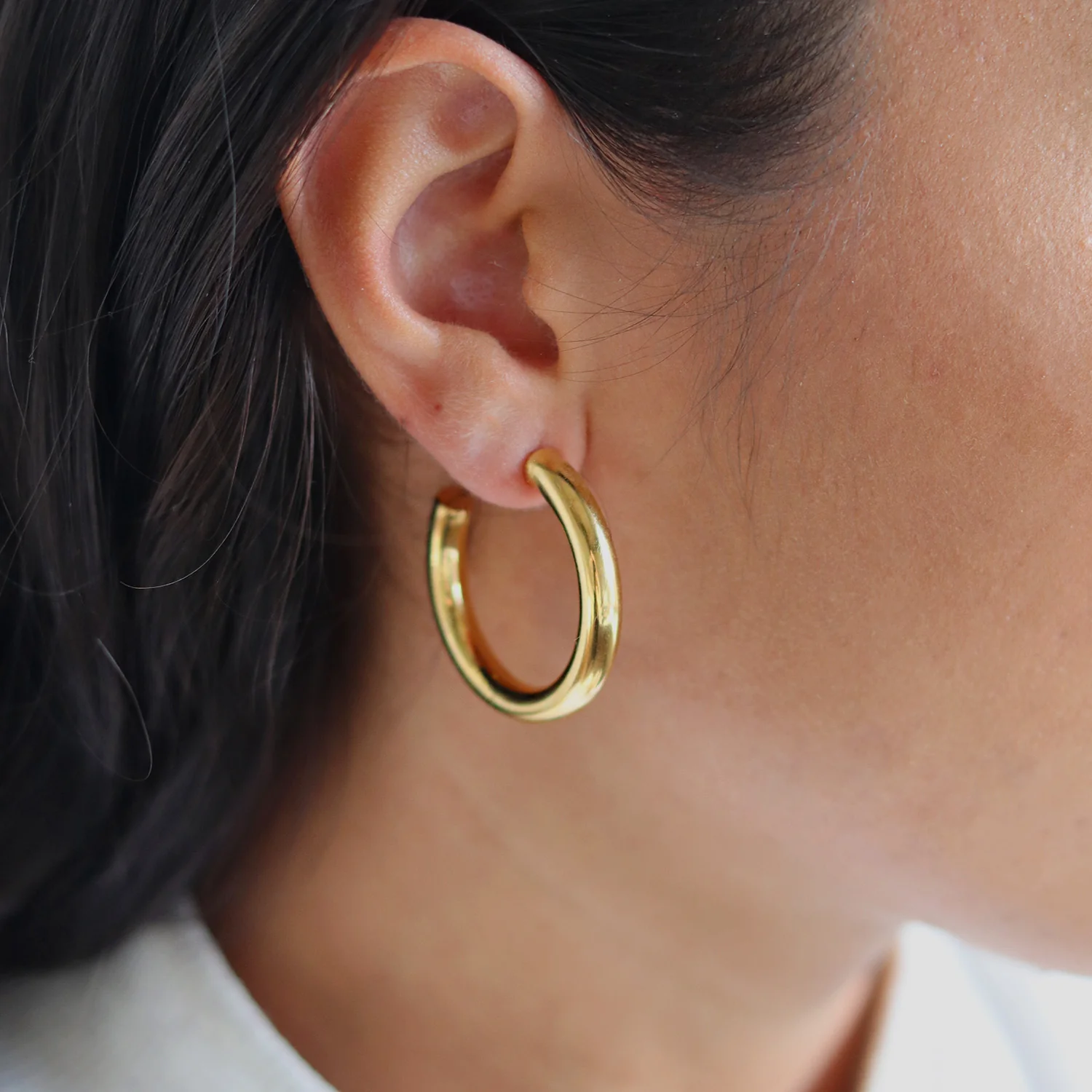 These lightweight thick CLASSIC HOOPS. are definitely a pair that every girl should have in their jewelrybox. Basic but chique! Which makes them the perfect everyday wear. Available in 2 sizes. Made from stainless steel, so waterproof!