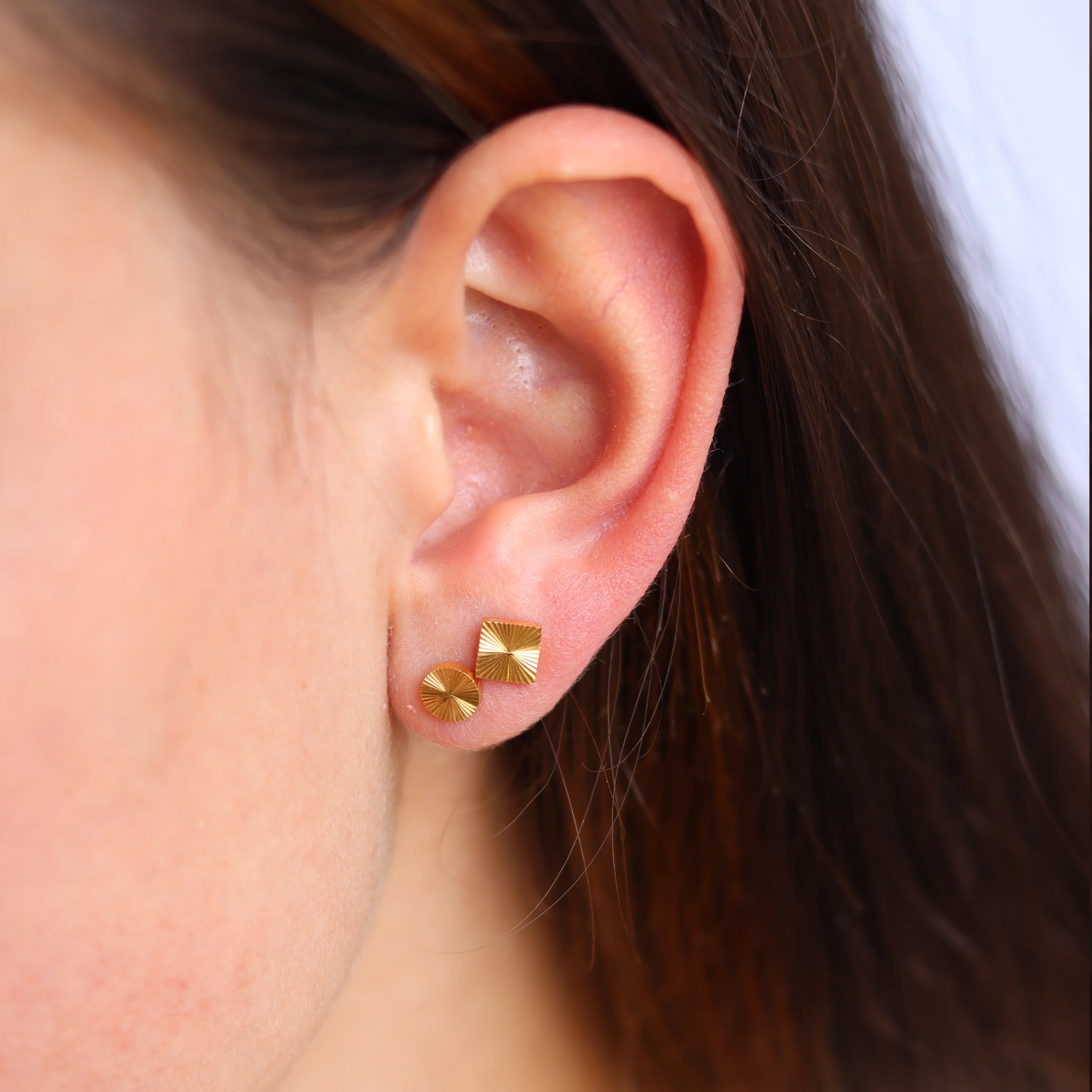 The perfect add to your earparty! Round studs with a relief which gives it a sunny kinda feeling. The studs are made of stainless steel, so waterproof! No need to take them off before showering or before you take a dip in that pool.